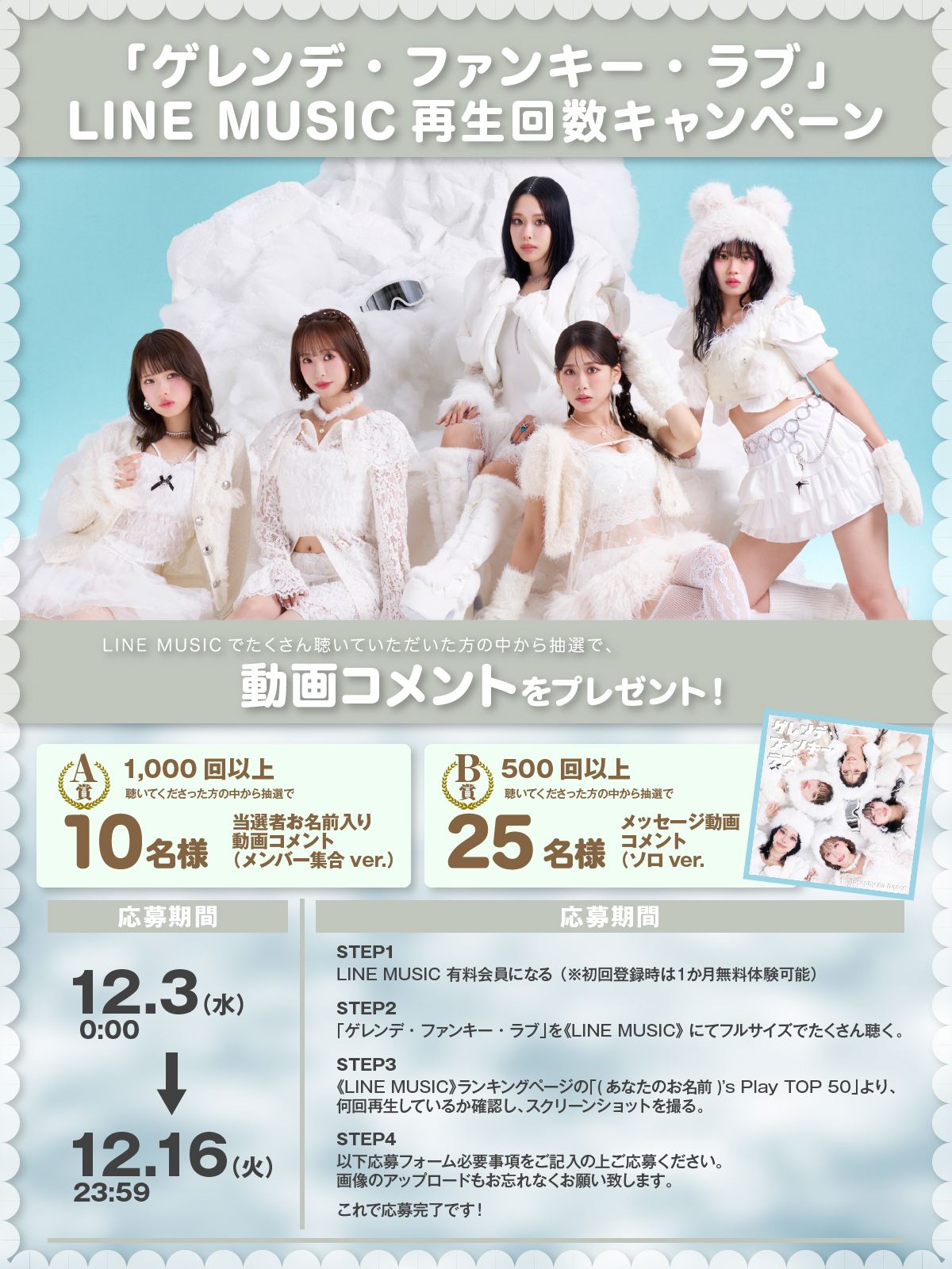 ※500回以上聴いてくださった方の中から抽選で、合計25名様(メンバー5人 ×5名様)