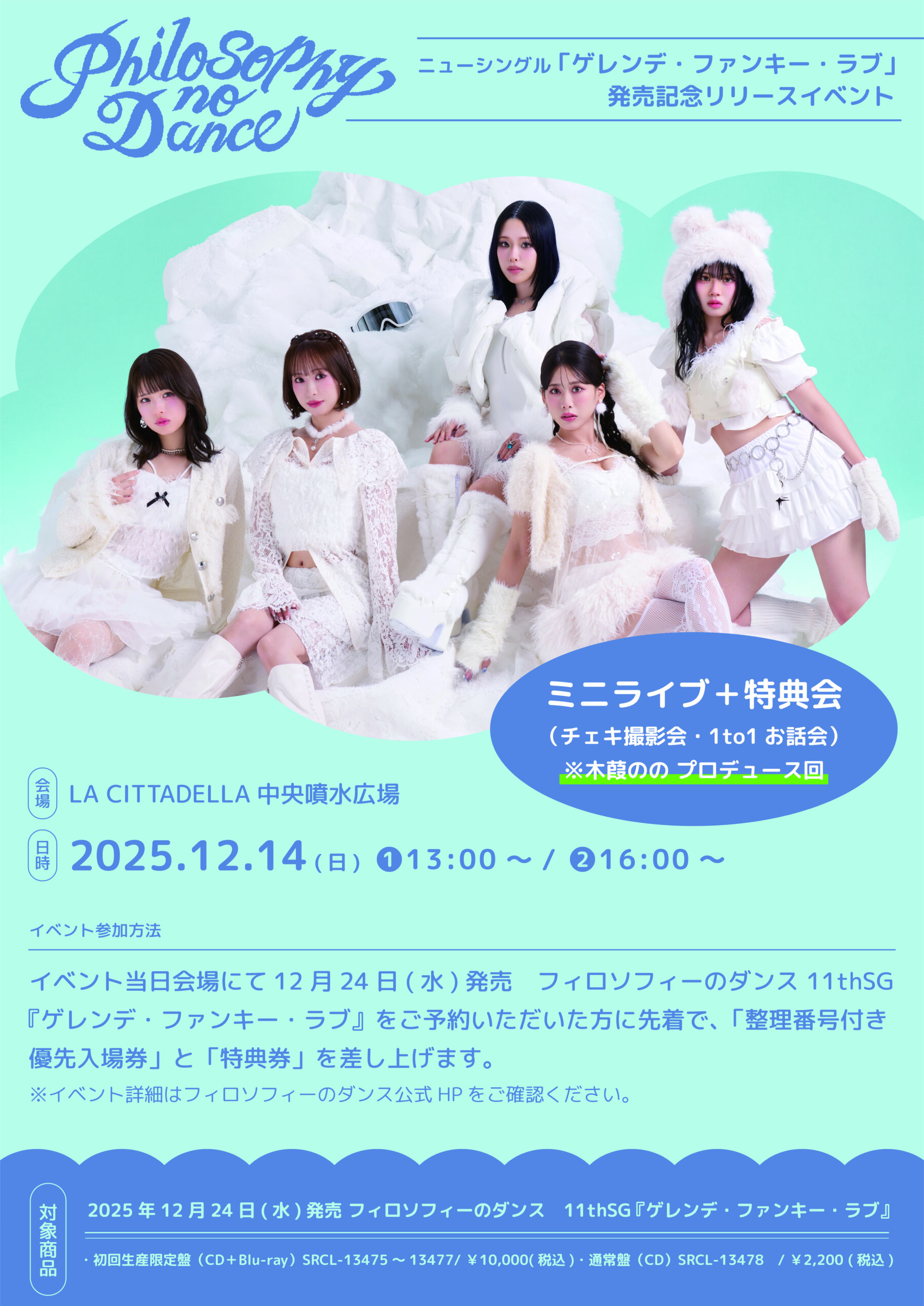 イベント当日会場にて12月24日(水)発売 フィロソフィーのダンス 11thSG『ゲレンデ・ファンキー・ラブ』をご予約いただいた方に先着で、「整理番号付き優先入場券」と「特典券」を差し上げます。