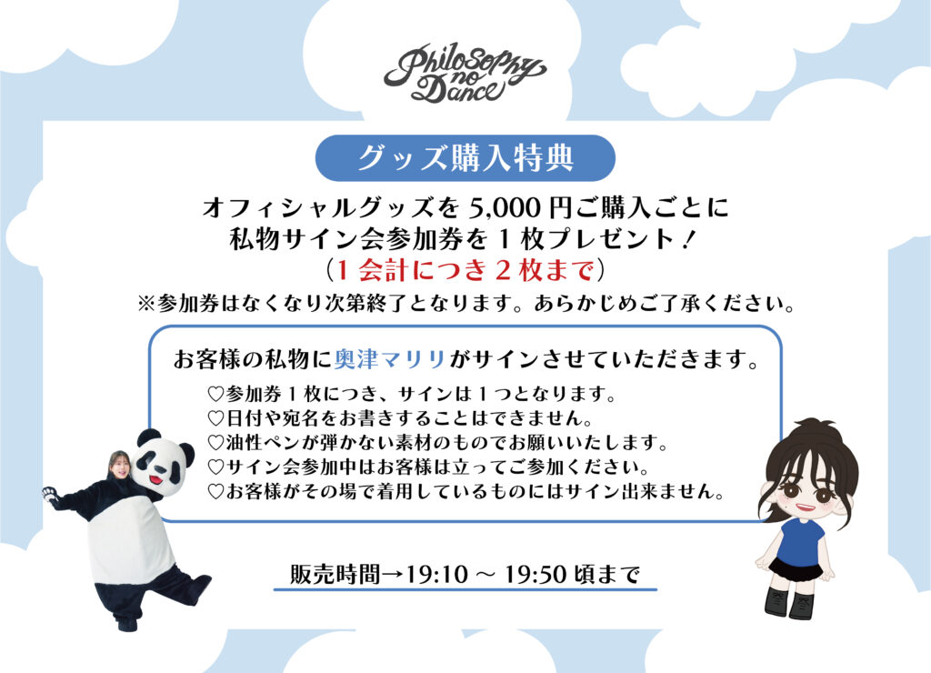 会場物販にてグッズをご購入いただいた方を対象に出演後に実施いたします会場限定特典会(私物サイン会)に参加できる参加券をお渡しいたします!